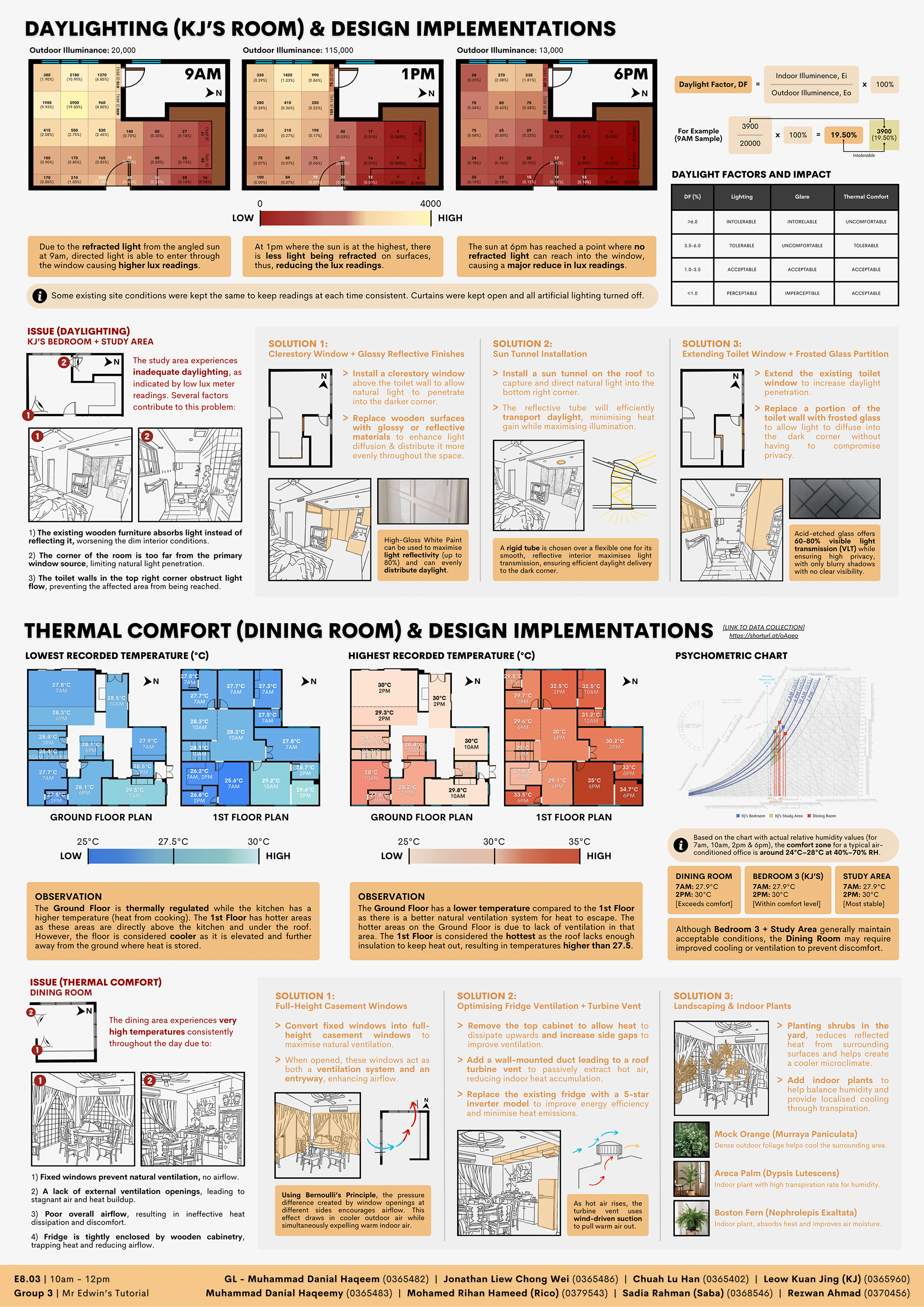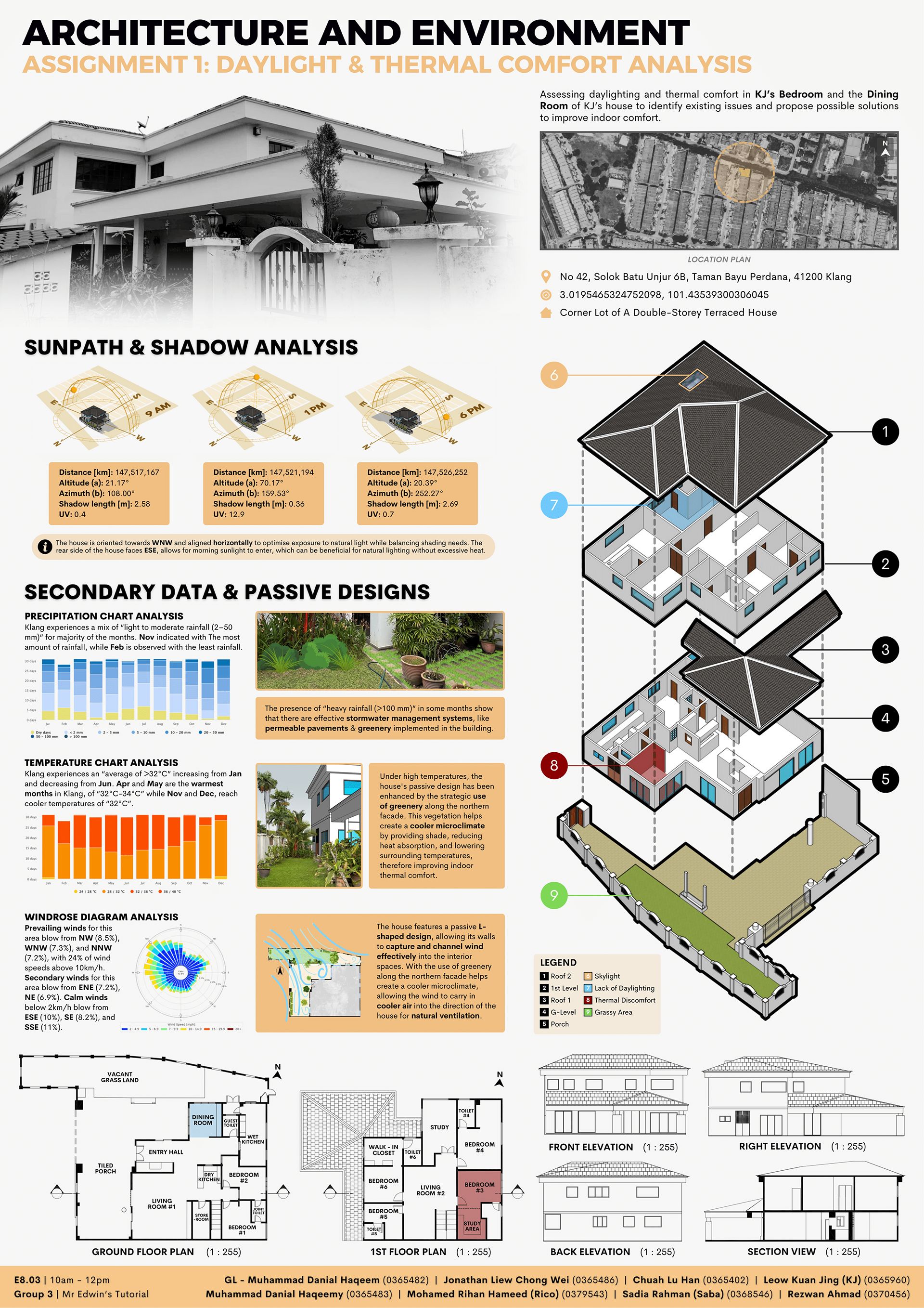 For this project, we were tasked with analysing daylight and thermal comfort in a selected residential space. Our focus was on KJ’s bedroom and the dining room in a double-storey terraced house in Klang. The goal was to identify existing daylighting and thermal issues and propose practical solutions to improve indoor comfort. This involved assessing factors like natural light penetration, heat gain, ventilation and the impact of surrounding environmental conditions.