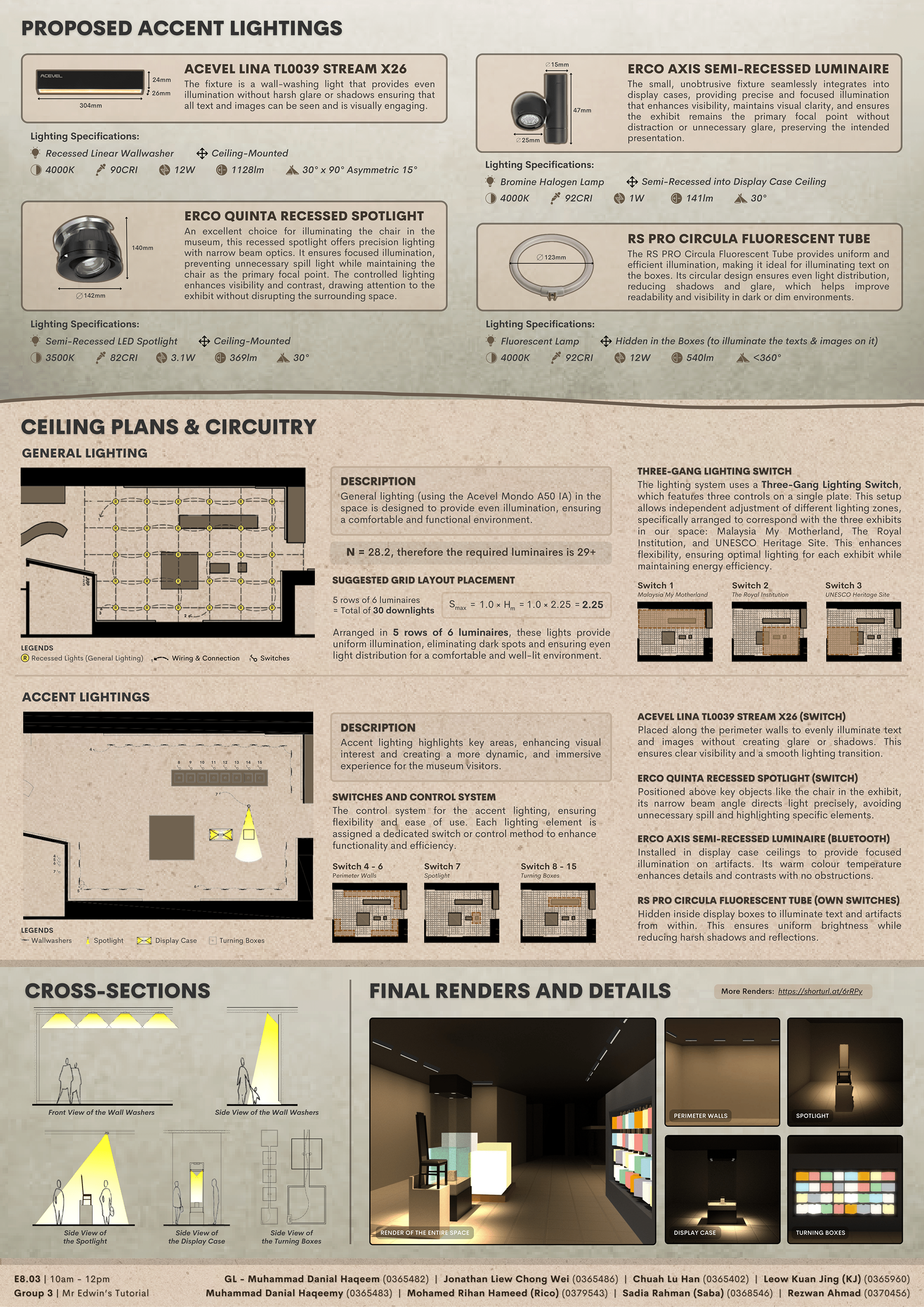 For this project, we were tasked with analysing a chosen space of our own choice and redesigning the artificial lighting using the Lumen Method. We focused on a space in Muzium Negara’s Gallery D, where we had to calculate the required number of luminaires, plan the layout, and justify every design decision to improve the lighting experience.